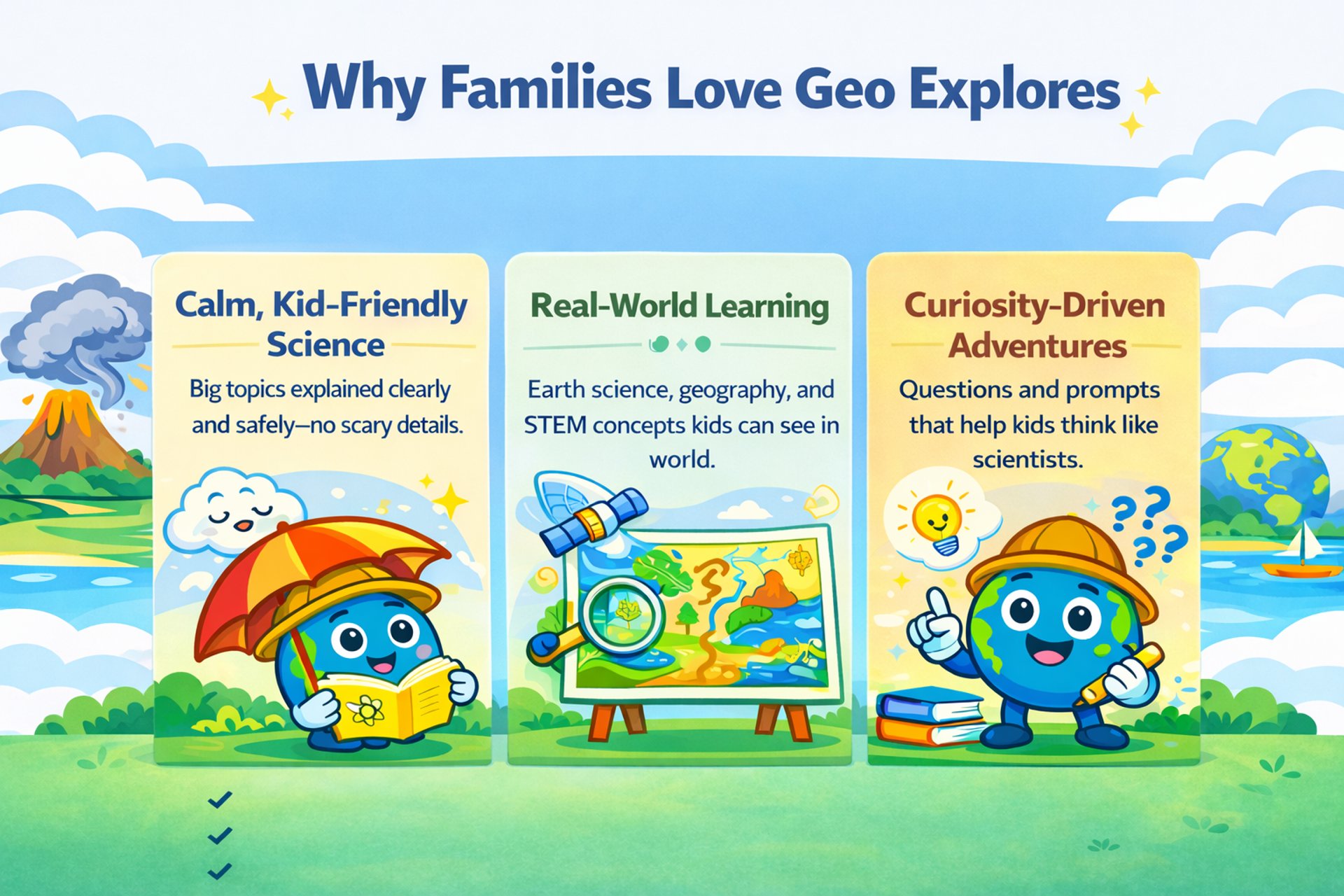 Geo Explores turns big science topics into calm, curiosity-driven adventures kids love. With friendly illustrations and real-world learning, it helps young explorers build confidence, ask questions, and discover how our world works—safely and joyfully.